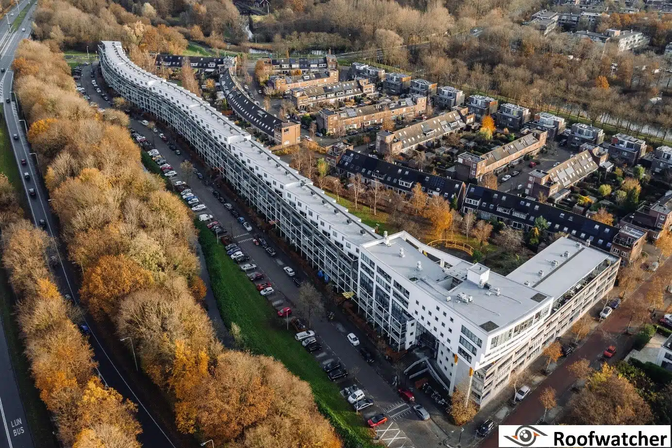 Renovatie daken VvE Ravelijn te Utrecht met 5100m2 Rhepanol dakbedekking met isolatie.