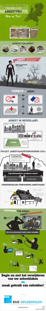 Hieronder vindt u een infographic met een aantal feiten en cijfers over asbest zoals het gebruik, het verbod en de gevaren, asbest in Nederland alsmede informatie over het project asbestverwijdering 2024. Daarnaast ook informatie over de subsidieregeling voor asbestdaken en een stappenplan hoe een professioneel bedrijf asbest verwijderd.